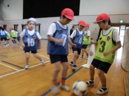 3・4校時にFC京都サンガの方に来ていただき,ボールを使ったいろいろな遊び方やミニゲームの仕方を教えていただきました。あっという間の2時間で,子どもたちはサッカーボールが大好きになりました。授業の最後に「友だちとパスをすることが楽しかったです。」「もっとゲームがしたかったです。」と発表していました。