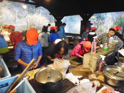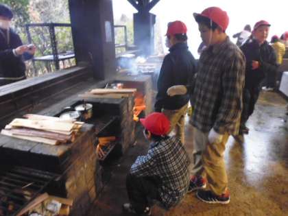 午後3時からは、夕食のカレーライス作りです。各役割分担に分かれて準備を始めています。火の係、材料を切る係、お米をとぐ係などです。どの子どもたちも自分の仕事に一生懸命です。