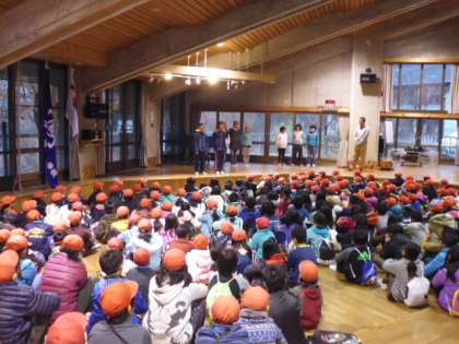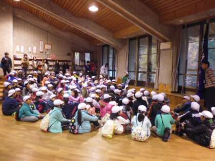 小雨降る朝を迎えました。山の家としては暖かい10度。鏡山小学校と松ヶ崎小学校との三校合同の朝の集いが始まりました。各校から代表の子どもたちから学校紹介がありました。金曜日まで一緒に生活する山の家での仲間になります。山の家滞在中に誕生日を迎える子どもたちに、山の家のマスコットが描かれたバッジをいただきました。恥ずかしながら、校長先生もいただきました。