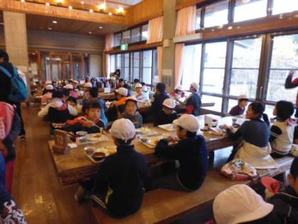 オムレツ・ウインナー・レンコンの天ぷら・生野菜など。味噌汁かスープ。ドレッシングも何種類か用意されています。子どもたちは昨日作った竹ばしで食事をしています。