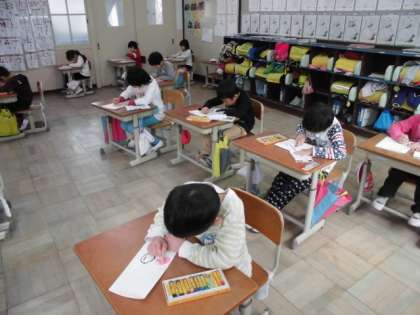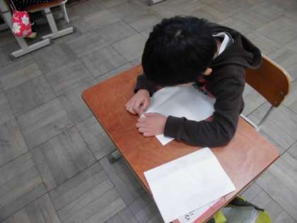 図工の時間に「ドアの向こうに」をしました。まず紙を折って開く仕組みを知り,いろいろな折り方をして,これで作ってみたい!というドアを作りました。そして,ドアを開ける前と開けた後で,どのように場面が変わると楽しい作品になるか考え,クレパスで描きました。