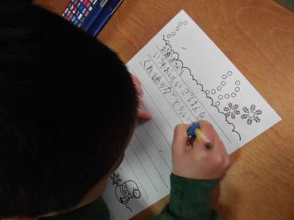 最後にありがとうを伝えたい人に手紙を書きました。「お父さんへ マラソンの練習を一緒にしてくれてありがとう。」「お母さんへ ご飯を作ってくれてありがとう。いつも美味しいよ!」と心を込めて書き,読み合いました。
