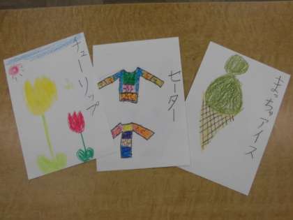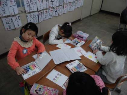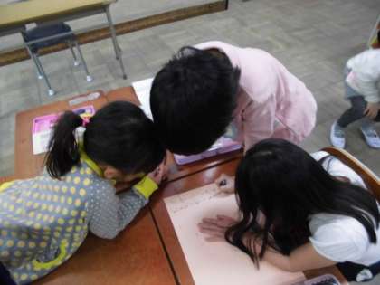 国語の時間に「おみせやさんごっこを しよう」の学習をしています。子どもたちはお店で売っている品物をカードに書いたり,ちらしの言葉を考えたり,看板を作ったりと同じグループの人たちと上手に話し合いながら取り組んでいます。