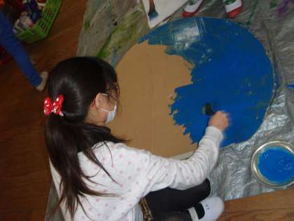 みんなの作品のテーマが決まったら、最後に三つのグループに分かれて作業をしました。作品を飾る台をつくる作業です。6年生は色塗り、5年生は看板作り、そして3年生は柱の飾りと、わかばの3人も分かれて参加しました。1月26日(月)に、また西京極小学校に集まった時は、できあがった完成した台に作品を飾って、みんなで写真を撮る予定です。