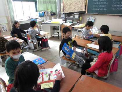 「ドアのむこうに」の作品を嬉しそうに見合う子どもたち。図工の鑑賞をしました。「いろいろな色を使って丁寧に描きました。」「魚と泳ぐ僕を描きました。ドアを開けると何が起こっていると思いますか?」「恐竜がスケートをしてるように描くことが難しかったです。」と自分の思いを上手に伝えていました。「上手ですね!」「このアイデアはおもしろいですね!」と感想や質問もたくさん返していました。