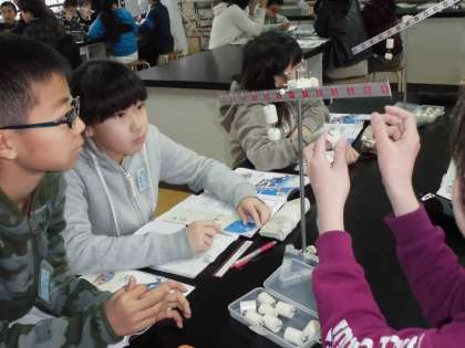 理科の授業では,てこのはたらきについて学習しています。右うでの目もり3に40グラムのおもりがつりさがっています。さあ,左うでの目もり6には何グラムのおもりをつるせばつりあうでしょう?結果は予想通りだったかな…。