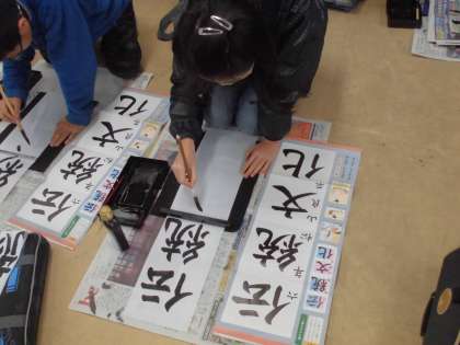 今日は,長い半紙で『伝統文化』に挑戦です。にじまないよう筆圧に注意しながら書いたり,バランスよく字間をあけたりして書きましょう。