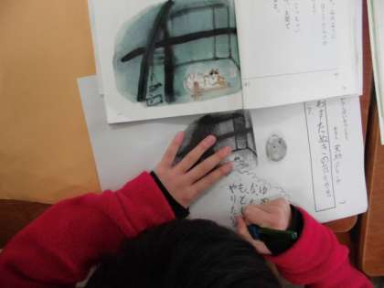 たぬきの糸車の学習も終わりに近づいてきました。今日のめあては,冬の間ずっと糸車をまわして糸を紡いでいたたぬきの気持ちを考えました。糸車があればよかったのですが…手で糸車を回す真似をしながら,たぬきになりきり気持ちをたくさん発表しました。「糸車って楽しいな!」「おかみさんが帰ってくるまでにたくさんの糸をつむごう!」「これでおかみさんに恩返しができたかな。」「糸をつむぐのはこんなに大変なんだな…」など。