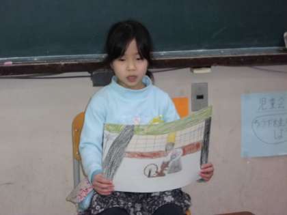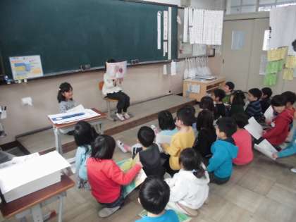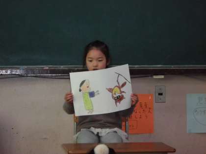 みんなの前で,自分の作った紙芝居を発表しました。昨日の練習よりも緊張している様子でしたが,自分で考えた工夫を生かして読んでいました。感想の交流では,「本当におかみさんがいるみたいでした。」「声の大きさを工夫していてよかったです。」など,友だちの発表のよいところをたくさん見つけていました。