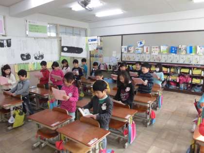 詩に合わせて,悔しがったり喜んだり,振り付けを入れたり,子ども達はいろいろな工夫をして,毎日楽しく音読しています。