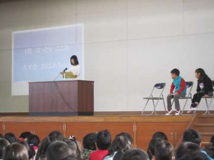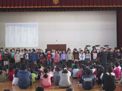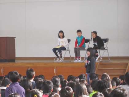 そして、1年生の作文発表。家族への感謝の気持ちを綴った作文を発表しました。聞いていた子どもたちも、1年生の素直な「ありがとう」の気持ちに共感していました。