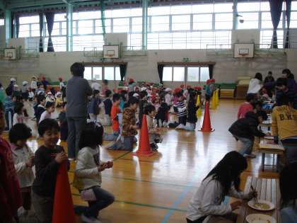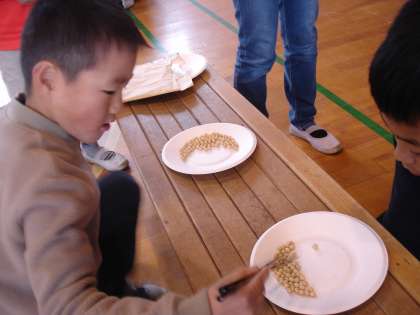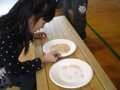 本日,中間休みに豆つまみ大会がありました。15秒で5個以上つまんでいる子もいて大変盛り上がりました。優勝したクラスはなんと「7分間で97個」という記録でした。お箸を使って食事をすることが多いので,これからもお箸が正しく持てるといいですね。