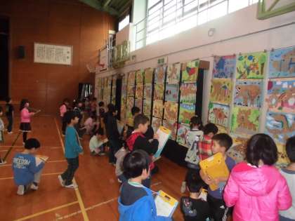 体育館に入ると,壁やフロアにいろいろな作品がずらりと並んでいて,「美術館みたい!」と,子ども達はびっくりしていました。