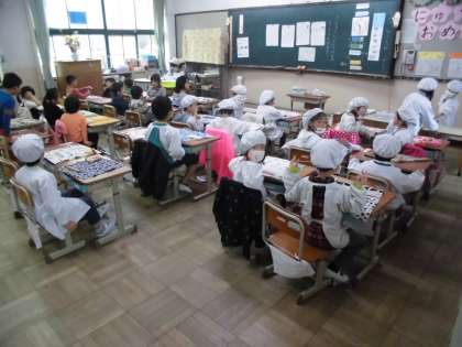 1年生にとっては待ちに待った給食。当番さんは給食エプロンを着て,スタンバイOK!