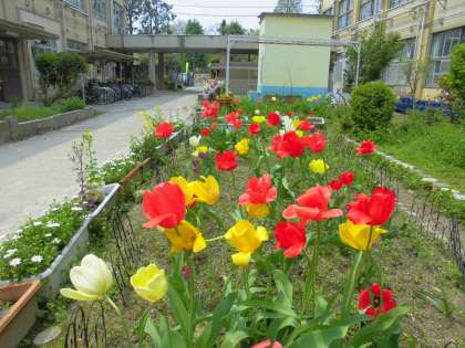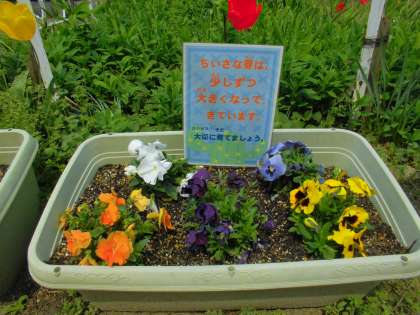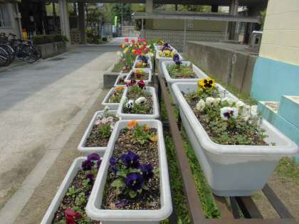 1年の中で一番中庭が色づく季節かもしれません。本校の中庭は花だけでなく,生まれたばかりの赤ちゃん亀や,赤ちゃんメダカもいます。いろいろな生き物を見ているだけで楽しい気分になりますよ。