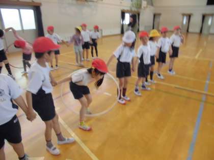 2人組でストレッチをしたり,ボールやフラフープを使って体をほぐしました。