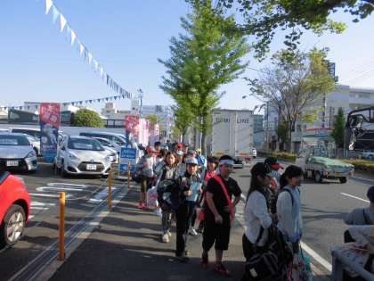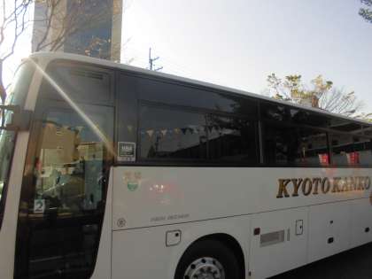 出発式後,学校を出てバスが待つ葛野大路通りへ。大型観光バスを見ただけでテンションが上がります。みんな無事に乗り込んで,いざ愛知県へ出発〜!お見送りに来ていただいた保護者の皆さま,ありがとうございました。おみやげを楽しみにして帰りをお待ち下さい。