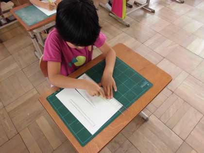 ものさしを使ってまっすぐな線を切ったり,紙を動かしてまがった線を切ったりしました。