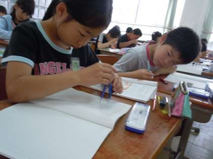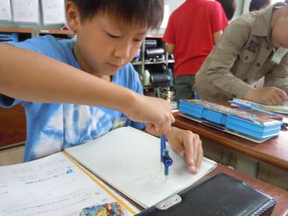 算数科「円と球」の学習で,コンパスを用いて円をかく学習が始まりました。初めは,「うまくかけへん!」とう声も聞かれましたが,練習を繰り返すにつれて,なめらかな曲線を描くことができるようになってきました。根気強く練習して,正確な円がかけるようになるまでがんばりましょう!