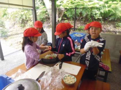 夕食は、野外炊事です。食材を調理する子供たちとかまどの火を守る係に分かれて、一斉に取りかかりました。あれこれ支持を出さなくても、案外班で協力してやるようです。見直しました。