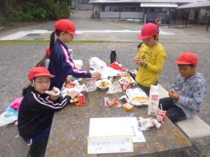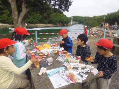 朝食は、パックドックです。野外の海の見える場所で準備をして食べました。ソーセージとキャベツなどの具材を挟んで焼きます。簡単でおいしいんです。さあ、食べようか、その時、先ほどから屋根の上から探りを入れていたトンビが子供のパンをさらって逃げていきました。ちゃんと見張ってないから。あらあら残念。