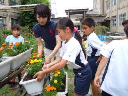 今日のそうじの時間,3年生のプランターにマリーゴールドを植えました。プランターを移動させたり,少し固まっていた土をスコップでほぐしたり,子どもたちは進んでがんばってくれました。6日の日曜参観でご来校される際には,中庭できれいな花を咲かせているマリーゴールドをお楽しみいただければと思います。