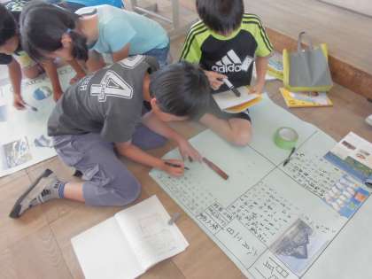 社会で調べたことを新聞にまとめています。沖縄や北海道の産業のこと,特徴的な家のこと,伝統文化のこと。これまで調べてきたことの中から選んで,表現します。