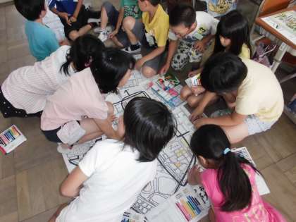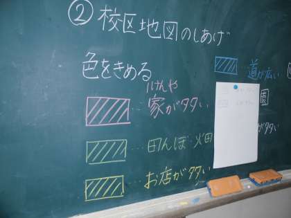 まちたんけんの地図まとめが出来上がりました。家が多いところは赤,田んぼや畑は緑色など全体で色を決めた後は,大きな白地図に色分けをしながらまとめていきました。