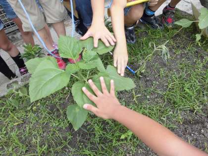 理科でひまわりの観察をしました。前回の観察から約2週間ぶり、、、さて,どのくらい大きくなったかな?観察前に,どのくらい大きくなったか予想してみると「20センチ〜30センチ」でしたが,実際は一番大きいもので45センチもありました。