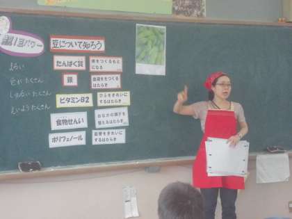 今日は,給食の時間に栄養教諭の石崎先生に来ていただき,大豆のことについてお話を聞かせていただきました。中には豆があまり得意でない子もいるようです。でも,豆の持っているたくさんの栄養について知り,驚きの表情を浮かべていました。