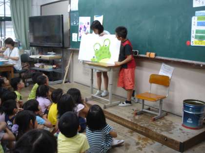 初日には,図書委員の人が大型絵本の読み聞かせにきてくれました。