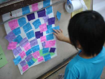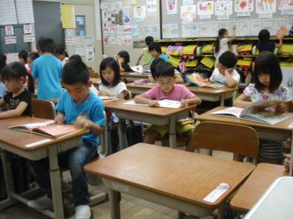読書タイムには,絵本を選んで楽しそうに読んでいます。3冊読んだら,あじさいが一つ咲きます!楽しい絵本と出会うと友だちに教えたくなるようで,教室の後ろにおすすめ絵本がたくさん並びます。外へ出られない梅雨も,1年生は楽しい絵本の世界へ出かけているようですね。