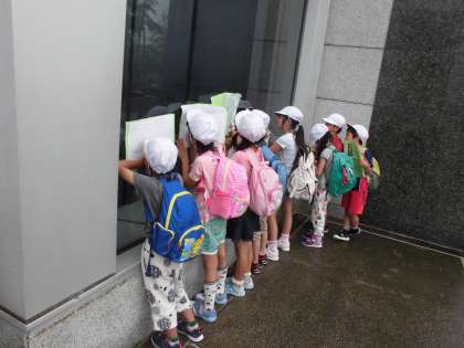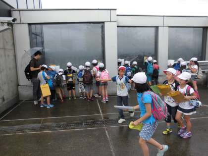 いよいよ,京都駅の最上階から,京都の街並みの観察がスタートしました。45分間しっかり観察して,しおりに書き込んでいきます。雨がぱらつく中,楽しそうに活動していました。