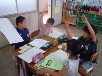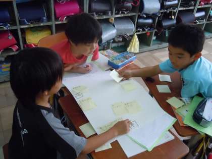 今日の社会科の学習では,社会見学で京都市の様子を観察し,気付いたり見つけたりしたことについてグループで交流をしました。気付いたことが書かれた付箋を,東西南北が書かれた画用紙に貼りながら進めていく交流で,子どもたちはそれぞれの様々な発見を伝え合っていました。今日の学習を受けて,次回はクラスでも交流を進めていきます。どのような新しい発見があるのか,楽しみですね。
