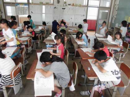 今日の国語では,「もうすぐ雨に」で作った,そうぞうのとびらの鑑賞をしました。作品とほめほめカードを机の上において,各自が自由に鑑賞します。いいな,と思った作品には,一言と名前をほめほめカードに書き込んでいきます。子どもたちは,時間いっぱいまで鑑賞を続け,授業の終わりには,たくさんの一言が集まりました。