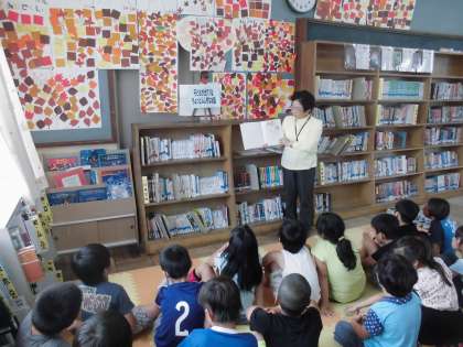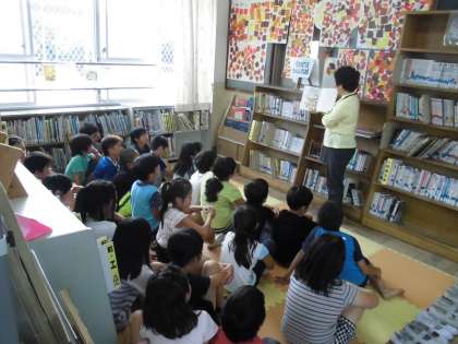 5時間目には,図書支援員の山本先生に本の読み聞かせと紹介をしていただきました。本のテーマを「子どもが出てきて,不思議なことが起こる話」でまとめてもらい,1冊を読み聞かせ,残り6冊は,子どもたちが読みたくなるように,それぞれの本に合った紹介をしてもらいました。ブックトークが終わった後に10分ほど自由に本を読む時間を取ると,紹介された本を読む子が大半で,多い所では4人で1冊の本を読んでいるということもありました。これを機に,色々な本と出会ってくれればなと思っています。