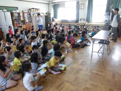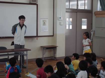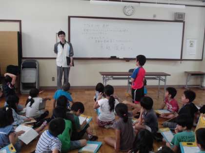 今日は,今年1年交流を進めていく京都市葛野老人デイサービスセンターの職員・木越さんを迎えて,デイサービスについてのお話を聞きました。どのような人が利用しているのか,内部はどのようになっているのか,どのような活動をしているのか,食事はどのようなものなのか等々,事前にお伝えしていた子どもたちの質問リストに沿って,時には子どもたちにも質問を投げかけながら丁寧にお話ししていただきました。最後には,利用者の方々と接するときに大切なこともお聞きし,これから交流を始める子どもたちにとって,とても勉強になる1時間になりました。