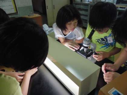 双眼顕微鏡でこれまで観察してきましたが,いよいよ,顕微鏡を使って観察します。操作は少し複雑になりますが,一生懸命ピントを合わせて,今日は中庭のビオトープの水にどんな生き物がいるか調べました。残念ながら生き物には出会えませんでしたが,使い方はばっちりな様子です。
