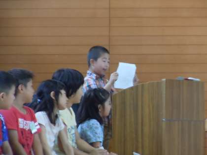 今日の葛野タイムで,全校児童の前で話したのは,感動体験を発表した3人だけではありません。司会が各クラス1名ずつ,フロア(感想交流時にマイクを持って移動し,感想の発表者を指名する役)担当を各クラス1名ずつが,前に出て,活躍してくれました。司会は,発表する作文の紹介が主な仕事で,それぞれが,ハキハキと大きな声で作文の内容に興味が湧くように紹介してくれました。