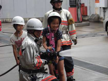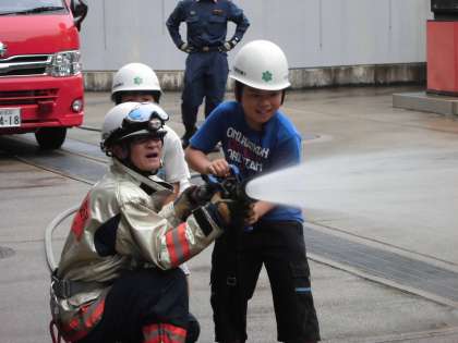 ヘルメットをかぶり消防士になり切って放水を行いました。