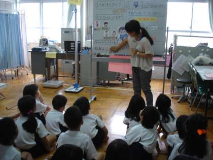 計測の前には,楽しい保健指導があります。子どもたちは,自分の体のことが詳しく学べる保健指導が大好きです。