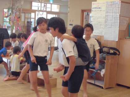 活動も後半になると,園児さんも葛野の5年生もどんどん慣れ,自然に話したり,ふれあったりする姿も見られるようになりました。