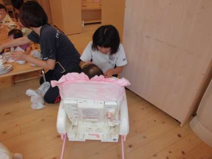 読み聞かせをしたり,ご飯を食べさせてあげたり,時間がたつにつれ,ぐっとお兄さんお姉さんになったような気がします。終わった後はみんなへとへと。よくがんばりました。