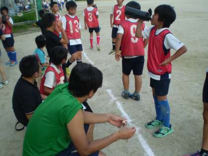 さすがに子どもたちも気合が入ります。ポジションも修正して,みんなが生き生きし出しました。あれよあれよとゴールが決まり,気がつけば連続して3得点!声もよく出ます。よく走ります。応援席も盛り上がります。ですが4点目が遠い・・・。シュートを打てども打てども決まらず・・・。でもやってくれました。待望の同点ゴ〜〜〜〜〜ル!そして逆転ゴ〜〜〜〜〜〜ル!!これぞホームゲームの強み,サッカーの醍醐味です。ゴールの度に葛野小全員が一つになって盛り上がります。2本目を終えて5−4。なんてドラマティックな展開。