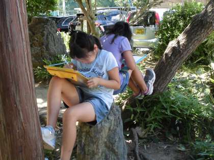 温度計が38度を指す中,校内の植物と動物の観察に出かけました。