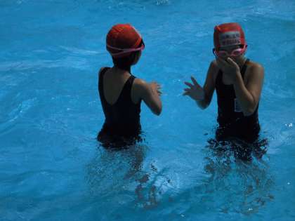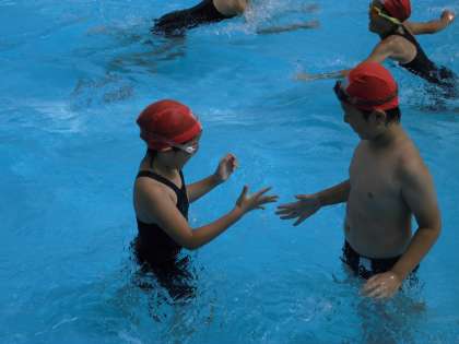 プールの中を必死に走り,