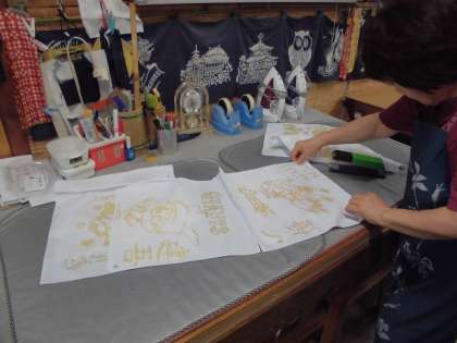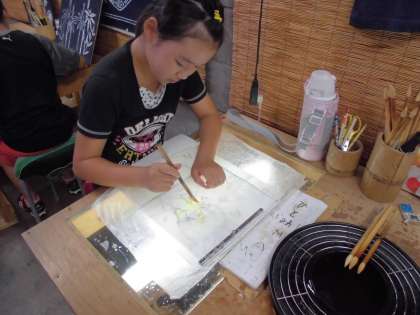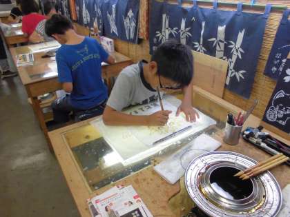 今日は地域の山本染工さんで,ろうけつ染め体験をしてきました。下絵をもとにろうで線をなぞっていきます。筆で絵をかくのはとても難しい!