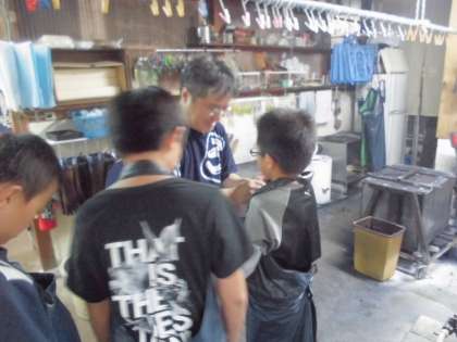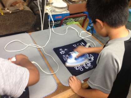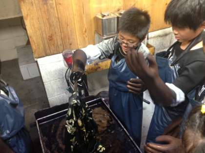 染料の窯をかき混ぜながら染めていきます。どんどん濃く染まっていく様子がおもしろいです。完成した作品は今日持って帰れます!さて,なにに使いましょうか。
