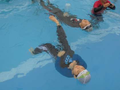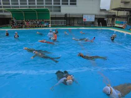 また,もし水に落ちてしまったら,泳がずにまずは浮く!!という練習をしました。どうしたら楽に浮くことができるでしょう。思い思いに実験します。仰向けになって体の力を抜いたらいい。という結論に至り,みんなで実践しました。