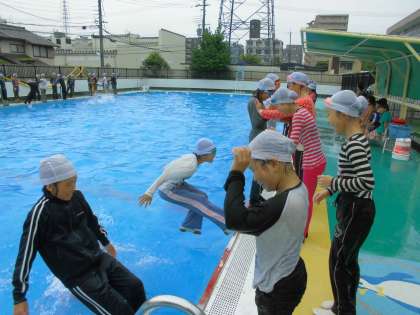 水難事故は思わぬ時に起こります。次は,プールサイドから水の上に倒れこむ活動です。友だちに押してもらうことで不意な状況を体感します。